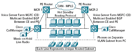 盡管大部分流量都位于VoIP VPN內(nèi)部,但是仍然有一些流量需要在VPN之間傳輸。這種外聯(lián)網(wǎng)流量目前通過PE在VPN之間傳輸,并且通過訪問列表來限制流量的傳輸方向。一個針對外聯(lián)網(wǎng)連接的防火墻解決方案將提供增強的安全性。BGP被用于為外聯(lián)網(wǎng)連接提供第三層路由冗余。