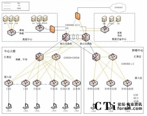 4506E作為新腫瘤大樓的匯聚層和整個(gè)醫(yī)院的小災(zāi)備中心,并上連至核心交換機(jī)以節(jié)約投資成本,而接入層繼續(xù)采用思科Catalyst 3560交換機(jī),既方便了管理,也為日后無線網(wǎng)絡(luò)的部署作好了準(zhǔn)備。(網(wǎng)絡(luò)拓?fù)鋱D如下)