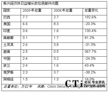 垃圾郵件:社交網(wǎng)站可能是網(wǎng)絡(luò)犯罪尋找新的受害者的地方。然而,垃圾郵件仍然是誘騙人們下載惡意軟件和慫恿他們購買諸如假藥等商品的可靠手段。《年度安全報(bào)告》估計(jì),2010年全球范圍的垃圾郵件量與2009年的水平相比,可能會(huì)增加30-40%。然而,思科自己的SensorBase數(shù)據(jù)顯示,美國和其他經(jīng)濟(jì)發(fā)達(dá)國家(例如歐盟內(nèi)部的國家)開始在他們各自的國家關(guān)閉垃圾郵件僵尸(spam zombies),而發(fā)展中國家(包括印度和越南)已經(jīng)成為垃圾郵件日益增長的源頭。事實(shí)上,美國不再是第一大垃圾郵件發(fā)送者。2009年巴西躍居第一。