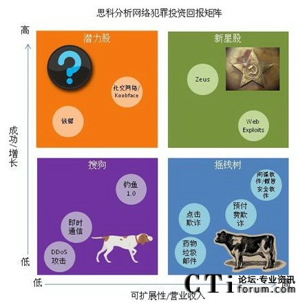 思科網(wǎng)絡(luò)犯罪投資回報(bào)(CROI)矩陣:今年的《年度安全報(bào)告》首次推出了思科CROI矩陣,以波士頓咨詢集團(tuán)著名的“增長-份額矩陣”為基礎(chǔ)。CROI分析了2010年何種類型的網(wǎng)絡(luò)犯罪將為成為“成功者”以及“失敗者”。該矩陣根據(jù)2009年的表現(xiàn),預(yù)測(cè)大量的銀行業(yè)Trojan