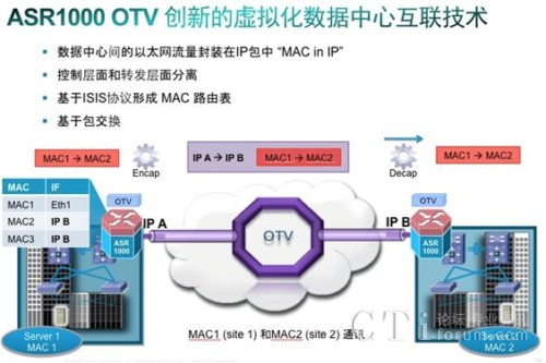Cisco OTV技術(shù)可以為跨任意傳輸網(wǎng)絡(luò)的二層連接擴(kuò)展,提供運(yùn)營優(yōu)化型解決方案。因此,OTV對于分布式數(shù)據(jù)中心的高效部署發(fā)揮著關(guān)鍵作用,有助于實現(xiàn)應(yīng)用可靠性和靈活的工作負(fù)載遷移。OTV是一項“MAC in IP”技術(shù)。通過使用MAC地址路由規(guī)則,OTV可提供一種疊加(overlay)網(wǎng)絡(luò),能夠在分散的二層域之間實現(xiàn)二層連接,同時保持這些域的獨(dú)立性以及IP互聯(lián)的容錯性、永續(xù)性和負(fù)載均衡優(yōu)勢。 圖1說明了這種工作機(jī)制。
