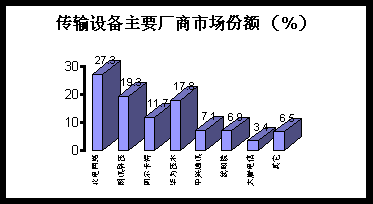 。1) 市場規(guī)模: 年內(nèi),寬帶網(wǎng)絡(luò)熱的興起極大地推動了傳輸設(shè)備市場的發(fā)展,以DWDM為代表的高端光傳輸設(shè)備已進(jìn)入大規(guī)模商用階段,包括光分插復(fù)用設(shè)備(OADM)和光交叉連接設(shè)備(OXC)與現(xiàn)有傳統(tǒng)的SDH等傳輸設(shè)備市場空前繁榮,全年出貨值達(dá)到104.8億元人民幣。