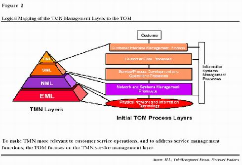 國(guó)際電聯(lián)的出發(fā)點(diǎn)雖好,但它更強(qiáng)調(diào)從網(wǎng)絡(luò)元素層開始的清晰的統(tǒng)一體系,而為了保護(hù)自己的商業(yè)秘密,各大運(yùn)營(yíng)商往往不希望公開自己的網(wǎng)絡(luò)元素層的標(biāo)準(zhǔn),同時(shí),網(wǎng)絡(luò)元素層的標(biāo)準(zhǔn)化對(duì)運(yùn)營(yíng)商的業(yè)務(wù)發(fā)展幫助不大。在熱烈討論了一段時(shí)間之后,TMN漸漸被忽視了。而另一只希望從技術(shù)角度解決管理問題的力量,電信管理論壇,卻帶有一定偶然性地逐漸確立了自己的地位。電信管理論壇在開始的時(shí)候并沒有夢(mèng)想能建立覆蓋整個(gè)電信運(yùn)營(yíng)企業(yè)的管理系統(tǒng),其初衷是解決在當(dāng)時(shí)日漸突出的跨企業(yè)的客戶數(shù)據(jù)交換問題。因此,和國(guó)際電聯(lián)不同,電信管理論壇從開始就非常強(qiáng)調(diào)實(shí)用性,并把目光集中到了各企業(yè)相互間有大量數(shù)據(jù)交換,因此迫切需要建立標(biāo)準(zhǔn)的服務(wù)管理層和網(wǎng)絡(luò)管理層,并提出了電信運(yùn)營(yíng)支持系統(tǒng)(OSS)的概念,并公布了模塊化的電信運(yùn)營(yíng)導(dǎo)圖(TOM)。