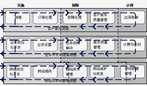 電信運(yùn)營(yíng)乃至整個(gè)電信企業(yè)的經(jīng)營(yíng)管理也越來越倚重于電信網(wǎng)絡(luò)支持系統(tǒng)。以最短的時(shí)間向用戶提供最新的業(yè)務(wù),對(duì)同一用戶提供豐富的消費(fèi)方式的選擇,對(duì)不同用戶進(jìn)行交叉銷售,乃至對(duì)價(jià)值鏈中的合作伙伴進(jìn)行有效管理,這些都要求業(yè)務(wù)管理與網(wǎng)絡(luò)體系的高度整合。西方的現(xiàn)代電信服務(wù)企業(yè),都紛紛以操作支持系統(tǒng)(OSS)的要求來規(guī)范自身企業(yè)的運(yùn)營(yíng),努力做到企業(yè)的每個(gè)業(yè)務(wù)操作都能在電信運(yùn)營(yíng)導(dǎo)圖(TOM)中找到相應(yīng)的位置,而每個(gè)步驟和其他步驟的銜接都符合TOM的規(guī)范要求。近年提出的內(nèi)容更加廣泛的擴(kuò)展電信運(yùn)營(yíng)導(dǎo)圖(eTOM)更是規(guī)范了電信業(yè)務(wù)管理的所有重要方面。