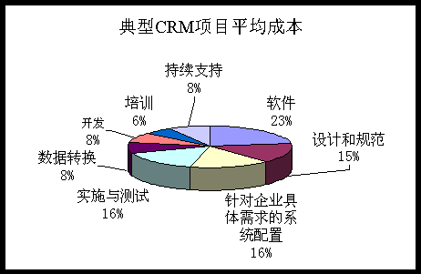 在企業(yè)確定了符合需求的CRM解決方案,包括軟件、供應(yīng)商以及技術(shù)性能之后,仍然有很多其他因素值得考慮。最主要的因素之一即成本。典型的項(xiàng)目的預(yù)算成本中軟件成本占1/3,咨詢(xún)、實(shí)施和培訓(xùn)成本占2/3。如下圖所示: