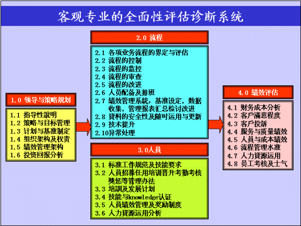 此評估診斷系統(tǒng)以1.0領(lǐng)導(dǎo)與決策規(guī)劃為起始點,作為建立一個以客戶為核心的高質(zhì)量客戶服務(wù)中心的推動根源,并且制定了一個良好的4.0績效評估系統(tǒng),以確保經(jīng)營目標(biāo)與標(biāo)準(zhǔn)質(zhì)量基準(zhǔn)能確實達成,此過程需透過嚴(yán)謹(jǐn)?shù)牧鞒淘O(shè)計和高效的人員管理去執(zhí)行這套運營體系。