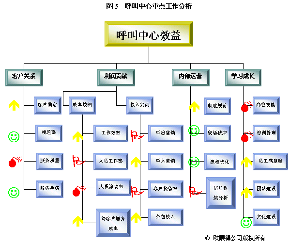根據(jù)年度重點(diǎn)工作及目標(biāo),我們就可以設(shè)計(jì)關(guān)鍵措施來使其實(shí)現(xiàn)。通常一項(xiàng)關(guān)鍵措施可以有助于幾個(gè)目標(biāo)的達(dá)成。如建立培訓(xùn)體系,可以使得在崗培訓(xùn)、上崗培訓(xùn)、多技能訓(xùn)練以及崗位技能達(dá)標(biāo)率有所提升,而體現(xiàn)在業(yè)務(wù)上的效果則是服務(wù)質(zhì)量的提升、呼出營銷收入增加和客戶挽留率提高。