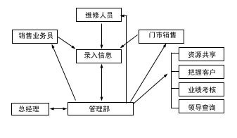 根據(jù)英普的業(yè)務(wù)管理模式,公司將門市銷售、維修部、大客戶部的業(yè)務(wù)管理工作,交由管理部全部管理和協(xié)調(diào),這三個部門將各自與客戶接待、交往過程、工作計劃全部明細(xì)記錄,交由管理部確認(rèn),管理部在保證必要保密的情況下,進行工作再分配,同時加強業(yè)務(wù)考核和其他管理職能工作。其業(yè)務(wù)流程如圖1。