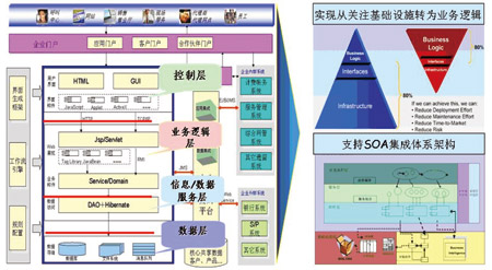 在企業(yè)應(yīng)用集成上,產(chǎn)品采用了面向服務(wù)的組件化設(shè)計(jì),遵循SOA體系架構(gòu),既支持基于服務(wù)的企業(yè)IT系統(tǒng)在數(shù)據(jù)、服務(wù)、流程等各個(gè)層面有效協(xié)同,也支持對(duì)各種遺留系統(tǒng)采用各種傳統(tǒng)的接口方式進(jìn)行集成。