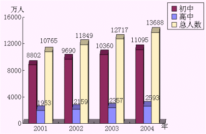 2001年,中國大陸中學(xué)學(xué)生人數(shù)已達10765萬人,而且學(xué)生人數(shù)還在快速增長。初中學(xué)生人數(shù)以每年6.5%的速度增長,普通高中學(xué)生人數(shù)也以每年10%-11%的速度增長。可以看出,教育市場巨大的潛力和商機。