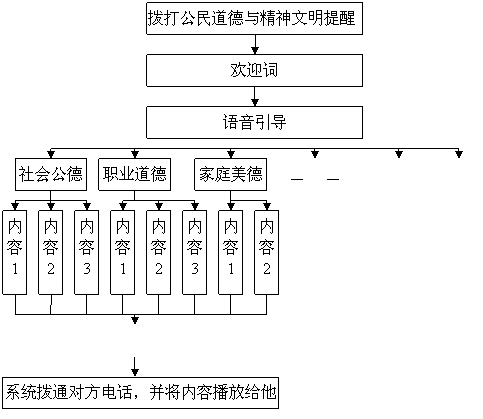 例如,某位公民對(duì)他(她)的鄰居或者同事一些不文明的行為(如深夜打麻將,亂倒垃圾,不講衛(wèi)生,破壞公物……)感到有必要進(jìn)行善意的提醒,但是,又覺得直接對(duì)他(她)說不合適,因?yàn)楫吘闺p方很熟悉或者還要共事,如果直接對(duì)對(duì)方進(jìn)行批評(píng)可能會(huì)引起對(duì)方的反感,即使對(duì)方認(rèn)為自己做的不對(duì),也會(huì)感到很尷尬,很失面子,在這種情況下,這為公民可以撥打“社區(qū)道德與精神文明提醒熱線”,選取熱線內(nèi)預(yù)先已經(jīng)錄制好,經(jīng)過審定的錄音內(nèi)容,選取內(nèi)容后輸入對(duì)方的電話號(hào)碼,熱線系統(tǒng)就可以將這段錄音播放給對(duì)方聽,對(duì)方聽到之后就會(huì)意識(shí)到或者思考自己的行為里面有沒有不文明的行為,同時(shí)會(huì)相應(yīng)的約束自己的行為。但是在此過程中對(duì)方并不知道為他(她)點(diǎn)播這段錄音的人的電話號(hào)碼,從而也不知道是誰給她留的錄音。當(dāng)然,還可以通過電子郵件或者手機(jī)短消息的方式對(duì)他(她)進(jìn)行提醒。