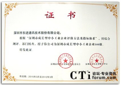 CTI論壇(ctiforum)4月6日消息(記者 潘婷婷):由深圳市政府大力支持,深圳市科工貿(mào)信委、深圳市中小企業(yè)服務(wù)中心,深圳市統(tǒng)計局,深圳大學(xué)管理學(xué)院聯(lián)合組織評測的“深圳市成長型中小工業(yè)企業(yè)500強(qiáng)”,于3月31日被正式認(rèn)定,深圳市東進(jìn)通訊技術(shù)股份有限公司榮列其中。今后,作為深圳市中小企業(yè)成長工程的重點培育對象,東進(jìn)技術(shù)將獲得政府公共資源的傾斜扶持,促進(jìn)加快發(fā)展,形成“示范效應(yīng)”。
