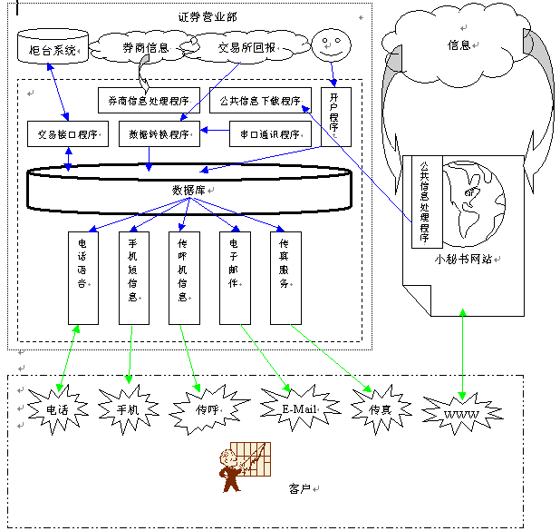 面對越來越激烈的競爭,各個券商使出渾身解數(shù),推出如透支、手續(xù)費返還等各種吸引客戶的手段;運用各種各樣的的交易方式如:營業(yè)部大戶室、家庭遠程大戶室、網(wǎng)上交易、電話委托以及手機炒股、股易通、WAP網(wǎng)上交易等等。然而,這些都屬于被動的服務方式,對于業(yè)余炒股的大多數(shù)中小戶、散戶來說,不可能每天花數(shù)小時瀏覽股市的各種信息。因此,不知道配股繳款、錯過配售新股等情況時有發(fā)生,給客戶造成較大的經(jīng)濟損失;一些重大消息、重大新聞不能及時獲知,延誤了投資的有利時機。據(jù)調(diào)查,目前參加二級市場配售的投資者比例不足20%。