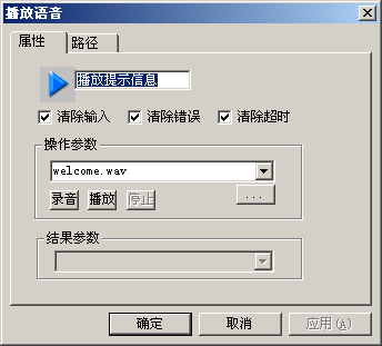 并不是所有的模塊都有操作參數(shù)和結(jié)果參數(shù),有些模塊可能只有其中的一個,有些模塊兩個參數(shù)都沒有。例如:播放語音模塊必需有操作參數(shù)--要播放的語音文件的文件名,但它沒有結(jié)果參數(shù);存儲變量模塊必需有結(jié)果參數(shù)--變量名,但它沒有操作參數(shù);運(yùn)算模塊既有操作參數(shù),也有結(jié)果參數(shù);取消轉(zhuǎn)隊(duì)列模塊和退出模塊則沒有參數(shù)。