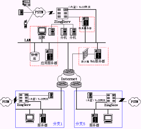 目前清華誠志數(shù)碼公司分支機(jī)構(gòu)有5個(gè),可以通過ZingServ交換機(jī)的內(nèi)置VoIP功能在5個(gè)分支機(jī)構(gòu)實(shí)現(xiàn)組網(wǎng),從而大大節(jié)省長(zhǎng)話費(fèi)用,并實(shí)現(xiàn)內(nèi)部分機(jī)號(hào)統(tǒng)一編碼:
