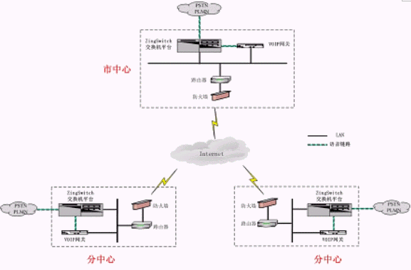 系統(tǒng)在市中心點(diǎn)和分布的遠(yuǎn)程座席所在縣市區(qū)分別部署相應(yīng)的VoIP網(wǎng)關(guān),市中心和各個(gè)縣市區(qū)都通過互聯(lián)網(wǎng)進(jìn)行連接和語(yǔ)音傳輸,客戶與遠(yuǎn)程座席之間的交流與普通的集中座席員之間毫無(wú)區(qū)別,遠(yuǎn)程座席只相當(dāng)于ZingSwitch交換機(jī)的一個(gè)遠(yuǎn)程分機(jī)。