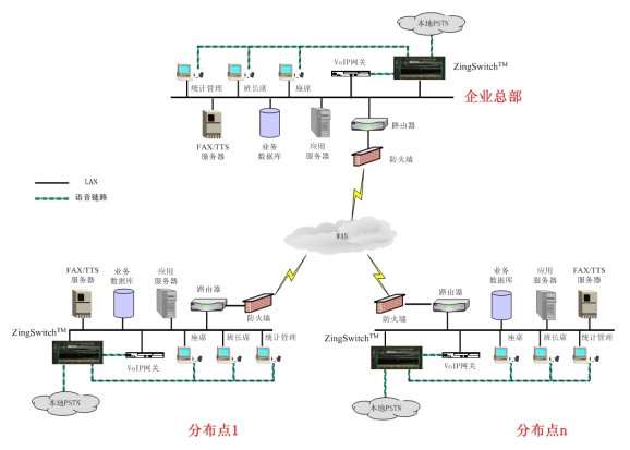 - 系統(tǒng)仍可同時在總部設立VoIP中心,用以實現(xiàn)數據和管理的集中,并且采用VoIP的方式,對各分布點的話務工作進行集中的監(jiān)控。