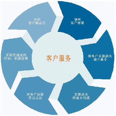 客戶服務(wù)不僅限于把公司提供給客戶使用?蛻舴⻊(wù)是與客戶交互的一個(gè)完整過程,包括聽取客戶的問題和要求,對客戶的需要作出反應(yīng)并探詢客戶新的需求。我們真的不能將其看成一個(gè)簡單的過程?蛻舴⻊(wù)可以用一個(gè)復(fù)雜的循環(huán)來表示,其中不僅僅包括了客戶和客戶服務(wù)部門,實(shí)際上包括了整個(gè)公司,即把公司整體作為一個(gè)受客戶需求驅(qū)動(dòng)的對象。