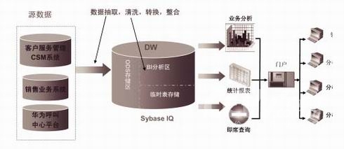 利用Sybase IQ的產(chǎn)品優(yōu)勢,我們將客戶服務管理系統(tǒng)、銷售業(yè)務系統(tǒng)、華為呼叫中心平臺的各種異構數(shù)據(jù)庫數(shù)據(jù),通過 IQ 提供的直接數(shù)據(jù)訪問方式,逐步實施對數(shù)據(jù)的抽取、轉換及加載(ETL),最終整合到 Sybase IQ 系統(tǒng)中,將原來分享的各系統(tǒng)數(shù)據(jù)統(tǒng)一存儲起來,為業(yè)務人員提供了統(tǒng)一的數(shù)據(jù)分析平臺。