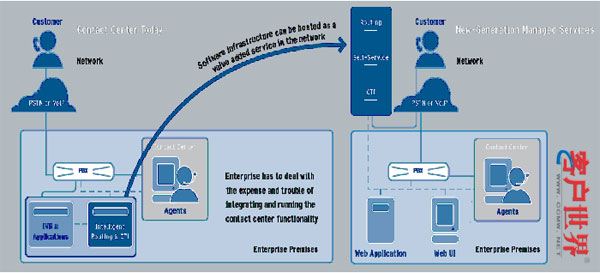 以國外的托管服務(wù)若建立在800號于C4/C5局用交換機(jī)上,許多用戶可以不用建制本地的排隊(duì)機(jī)就可以實(shí)現(xiàn)托管服務(wù)。目前國內(nèi)的運(yùn)營商若要直接在C4/C5局用交換機(jī)因?yàn)闆]有C4/C5的CTI服務(wù)器可以連接,所以有其困難的地方,只能采用800號智能網(wǎng)新增業(yè)務(wù)與本地企業(yè)排隊(duì)機(jī)連網(wǎng)的方式來完成。但國內(nèi)運(yùn)營商未來都會朝向NGN,采用軟交換的方向來看,企業(yè)可能再也不用采購本地排隊(duì)機(jī),對于呼叫中心托管的業(yè)務(wù)是一個(gè)很好的方向。