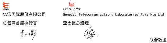 屆時,不僅有Genesys全球總裁率領(lǐng)資深專家向您介紹客戶關(guān)系管理領(lǐng)域的市場動向與未來趨勢,還帶來了全球拭目以待、發(fā)熱發(fā)光的Genesys最新產(chǎn)品 ── G7。此外主辦單位更有幸請來兩岸三地知名客戶,提供商務(wù)應(yīng)用實(shí)例,共同分享其成功經(jīng)驗(yàn),為您的企業(yè)及同行業(yè)提供了相互交流的機(jī)會。