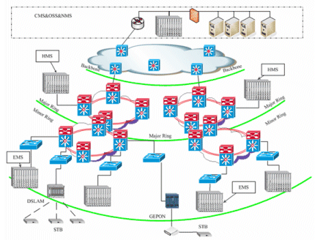 奔流(RollingStream)系統(tǒng)可以支持百萬級別的用戶規(guī)模,支持3級和多級部署架構(gòu)。包括中心節(jié)點(diǎn)(CMS)、區(qū)域匯聚節(jié)點(diǎn)(HMS)以及邊緣服務(wù)節(jié)點(diǎn)(EMS)。奔流(RollingStream)系統(tǒng)對于寬帶IP網(wǎng)絡(luò)的容忍度是很高的,可以支持各種網(wǎng)絡(luò)承載形式,也可支持各種接入方式。如LAN接入、DSLAM接入、GEPON接入。對于IPTV系統(tǒng),可建設(shè)專網(wǎng),CMS和HMS、EMS直接相連,也可以旁掛在城域網(wǎng)上。另外,無論P(yáng)PPoE還是DHCP上網(wǎng)方式都可以支持。