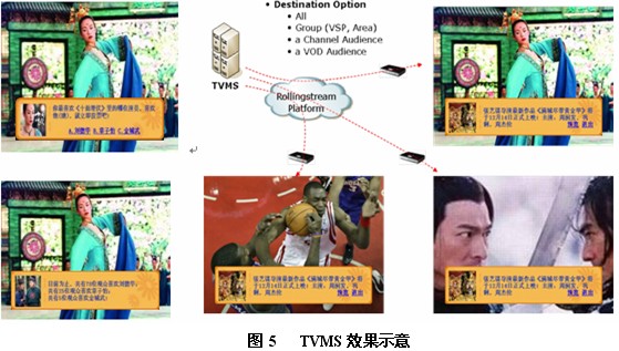 TVMS可以支持用戶間通過電視屏幕顯示手機(jī)短信息;支持向全頻道發(fā)送信息,如政府公告、天氣預(yù)警、水電費(fèi)用催繳等等;也可以向特定人群發(fā)送廣告信息;廣電運(yùn)營(yíng)商可通過該功能開展互動(dòng)娛樂業(yè)務(wù)。