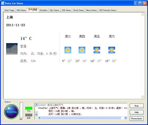 比方說這個(gè)關(guān)于空調(diào)問題,我們過去,空調(diào)的命令詞是“把空調(diào)打開,空調(diào)溫度提高3度。”現(xiàn)在我也可以這樣說,空調(diào)調(diào)高一點(diǎn),我有點(diǎn)冷,也可以。就是你在車?yán)镞呁耆梢杂媚阕约旱恼Z言來說你想干的事。比如說,前邊你不知道明天天氣會(huì)怎么樣,人一般都會(huì)想想,明天天氣如何,或者是告訴我天氣預(yù)報(bào)。但是你也可以這樣說。明天會(huì)下雨嗎?也可以這樣說;蛘吣氵@樣說,你說,今天大盤怎么樣。完全是用自然語言來說。堵不堵車,“查詢交通情況!边@就是,實(shí)際上可以有各種不同的說法來完成這個(gè)任務(wù),這是我們自然語言的一個(gè)演示。