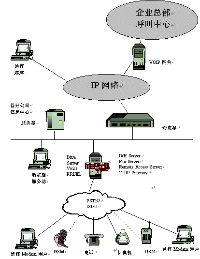 隨著信息技術(shù)的發(fā)展,企業(yè)對(duì)通訊的需求越來越多,并越來越呈現(xiàn)多樣性,有語(yǔ)音通訊,傳真通訊,數(shù)據(jù)通訊等。我們拿銀行作為一個(gè)例子來分析,目前我國(guó)大多數(shù)大型商業(yè)銀行都在各個(gè)市(甚至縣)建有一個(gè)IVR交互式語(yǔ)音應(yīng)答系統(tǒng)以滿足其客戶的語(yǔ)音查詢需求;同時(shí),系統(tǒng)也要具備傳真通訊功能,以滿足某些大客戶需要傳真回復(fù)確認(rèn)的需求;目前,各個(gè)商業(yè)銀行也建立了自己的企業(yè)銀行平臺(tái),所以中心也需構(gòu)建一個(gè)接入服務(wù)器來滿足某些大客戶的遠(yuǎn)程撥號(hào)接入進(jìn)行遠(yuǎn)程交易;隨著Call center 應(yīng)用的興起,各商業(yè)銀行的省行呼叫中心需要將其各市行的語(yǔ)音接入平臺(tái)(IVR),通過VoIP 技術(shù),接入到省行的Call Center 中心,從而建立一個(gè)分布式的Call Center,以提高對(duì)其客戶服務(wù)的滿意度 。