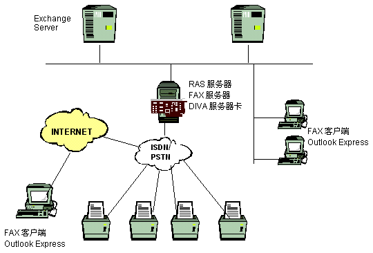 終端設(shè)備:FAX Client(也可以用OUTLOOK 98/EXPRESS)主要是對FAX Mail進(jìn)行再處理, 比如可以指定到可用的打印機(jī)或傳真機(jī)打印等。