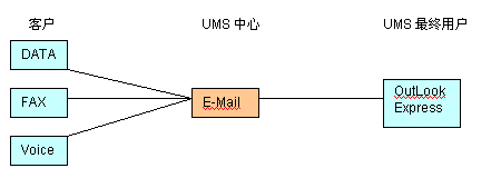 UMS的起源可追溯到數(shù)據(jù),傳真和語音三大應(yīng)用的整合,即統(tǒng)一為E-Mail形式,在企業(yè)內(nèi) 部或INTERNET郵件系統(tǒng)轉(zhuǎn)發(fā)。實(shí)現(xiàn)起來也較簡單,如下圖所示: