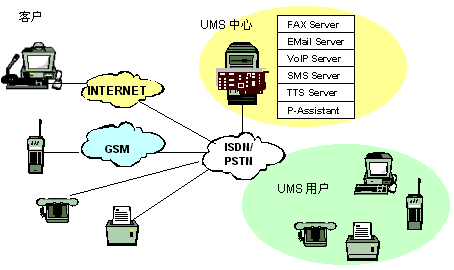 客戶用電子郵件、語音、尋呼、移動(dòng)短消息、傳真等與UMS用戶聯(lián)系,UMS中心啟動(dòng)相應(yīng)的服務(wù)與客戶建立連接,將客戶所發(fā)信息按識別標(biāo)識直接轉(zhuǎn)發(fā)到UMS用戶或中繼服務(wù)器,若因UMS用戶不在等原因,無法直接聯(lián)系,系統(tǒng)會提示客戶選擇別的方式聯(lián)系。也可將其存儲,并進(jìn)行必要的格式轉(zhuǎn)換與管理,這時(shí)UMS中心可以主動(dòng)呼叫UMS用戶的手機(jī),傳真機(jī),電話等主動(dòng)將信息送到,UMS用戶也可以在任何時(shí)間、任何地點(diǎn),從固定電話網(wǎng)(普通電話、傳真機(jī)、IC卡電話等)、移動(dòng)網(wǎng)(GSM、模擬、CDMA、WAP手機(jī)、掌上電腦、PDA等)、尋呼網(wǎng)、互聯(lián)網(wǎng)(PC)訪問中心服務(wù)器查詢,索取個(gè)人信息。
