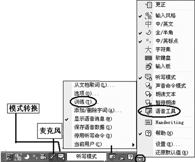 如果您以后想再次進行語音訓(xùn)練,那么,可以點擊語言欄上的“語音工具”按鈕,然后單擊“訓(xùn)練”來對計算機進行語音識別的訓(xùn)練(如圖3)。