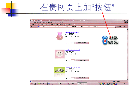 簡(jiǎn)單地說,就是當(dāng)有客戶瀏覽到網(wǎng)上購物的網(wǎng)頁時(shí),若有任何疑問或想立即購買,只要點(diǎn)擊在網(wǎng)頁上的“按鈕”鍵,就可以直接接通到網(wǎng)站的客服中心,實(shí)現(xiàn)即時(shí)地語音互動(dòng)。也不需再像以前那樣發(fā)E-MAIL或撥電話號(hào)碼了。效果可謂是立竿見影。(如圖示)