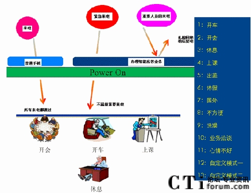 智能應(yīng)答業(yè)務(wù)是針對消費(fèi)者不便通話時(shí)的一個(gè)增值業(yè)務(wù)。當(dāng)被叫用戶有來電時(shí),因?yàn)樽约旱脑虿槐阃ㄔ挾鴴鞌嚯娫捄笸ㄟ^手機(jī)彈出的菜單,供用戶選擇與對方進(jìn)行的后續(xù)溝通。被叫用戶可以根據(jù)所處的情況選擇對應(yīng)的情景,系統(tǒng)將根據(jù)用戶選擇的情景對應(yīng)給主叫用戶發(fā)送短信和放音。智能應(yīng)答業(yè)務(wù)給了我們禮貌拒接的機(jī)會(huì)。當(dāng)您正在會(huì)議室里和客戶如火如荼的策劃下個(gè)項(xiàng)目,當(dāng)然不想被其他人打擾。突然有個(gè)電話打了進(jìn)來,接還是不接,不接有可能是一個(gè)潛在的客戶,接了又是對目前工作的一種打斷。如果你辦理了智能應(yīng)答業(yè)務(wù),當(dāng)你掛斷電話的同時(shí)手機(jī)上將出現(xiàn)一個(gè)菜單,你可以根據(jù)當(dāng)前具體情況選擇目前所處的情景(開車、開會(huì)、上課……等)。如你選擇了某種情景,系統(tǒng)將根據(jù)用戶選擇的情景,給主叫用戶播放相應(yīng)的語音通知(如:“您撥叫的用戶正在開會(huì),請稍后再撥”)。