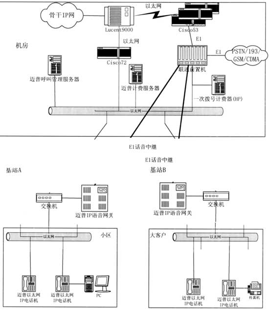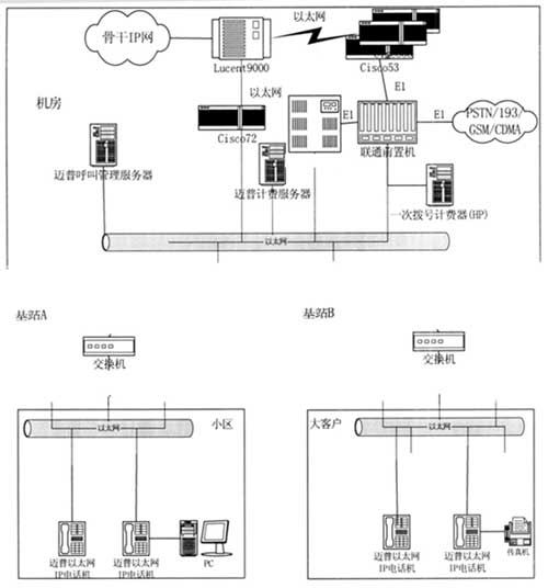 。。在兩個方案中,采用了邁普呼叫管理服務(wù)器、計費(fèi)服務(wù)器以及以太網(wǎng)IP電話機(jī),分別擔(dān)任呼叫、話音計費(fèi)等網(wǎng)絡(luò)管理工作。