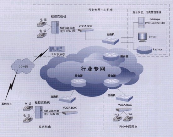 中心并設(shè)立一級(jí)計(jì)費(fèi)認(rèn)證及結(jié)算中心、網(wǎng)絡(luò)管理中心(VBMS),對(duì)網(wǎng)內(nèi)電話集中管理和計(jì)費(fèi)。通過在各地市機(jī)構(gòu)原有的內(nèi)部網(wǎng)絡(luò)基礎(chǔ)上增加數(shù)臺(tái)VOCABOX實(shí)現(xiàn)語音終端接入,并在地市機(jī)構(gòu)通過帶FXO接口的VOCABOX實(shí)現(xiàn)內(nèi)部IP電話與內(nèi)部電話網(wǎng)絡(luò)的呼叫轉(zhuǎn)接,網(wǎng)絡(luò)拓?fù)溥B接如下圖所示