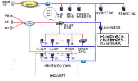 鐵路客戶服務中心系統(tǒng)主要是由帶語音板卡的計算機或排隊交換機、CTI服務器、IVR服務器、應用服務器/數(shù)據(jù)庫服務器、人工座席系統(tǒng)等硬件設備和應用軟件組成。它以電話服務為主要服務方式、結(jié)合計算機信息系統(tǒng)的資料數(shù)據(jù),為客戶提供全方位的服務,包括業(yè)務查詢、業(yè)務咨詢、業(yè)務受理、投訴和建議、市場調(diào)查等功能。