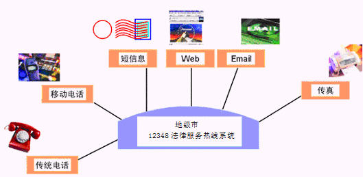 居民利用電話、傳真、手機等撥打某一特服號碼(如12348)進入地級市法律服務熱線系統(tǒng),本系統(tǒng)依托地級市司法行政部門/法院各類業(yè)務技術支持系統(tǒng)和網(wǎng)絡系統(tǒng),通過人工受理或自動語音服務等方式全天24小時不間斷地為人民群眾提供各種法律服務;形成了對外服務于百姓的無形窗口,對內(nèi)管理、分析、決策系統(tǒng)相結合的多媒體呼叫中心。