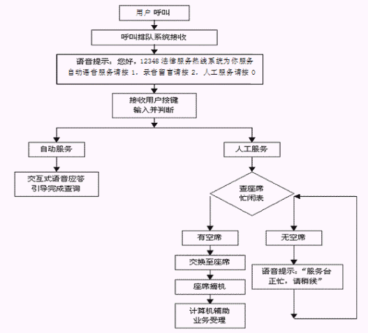 本呼叫中心系統(tǒng)中來話通過排隊交換機/帶語音板卡的高性能工控機的話路自動分配(ACD)技術及CTI 模塊的智能呼叫路由技術的組合,使話路可在IVR自動語音設備、人工坐席中進行自動的話路分配;當坐席收到來電時,CTI 服務器啟動坐席去觸發(fā)其業(yè)務功能模塊;坐席可通過數(shù)據(jù)庫服務器與整個系統(tǒng)的業(yè)務數(shù)據(jù)系統(tǒng)進行有機結合,坐席就可訪問系統(tǒng)中的業(yè)務信息,為人民群眾提供法律咨詢、人員調(diào)度等服務,實現(xiàn)"一個電話解決用戶所有問題" ;通過坐席完備的電話功能及CTI 服務器可控制交換機/語音板卡實現(xiàn)呼叫轉(zhuǎn)移、來話保留、多方通話、與自動語音之間的相互轉(zhuǎn)接等功能,實現(xiàn)了與其他話務員以及相關工作人員的相互轉(zhuǎn)接。