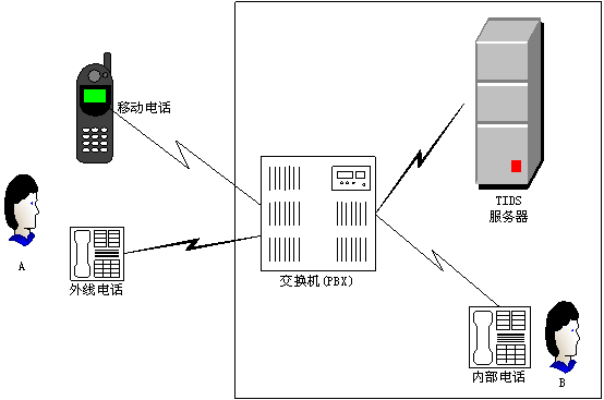 如圖1所示,在一個(gè)典型的應(yīng)用環(huán)境里,TIDS系統(tǒng)可與公司或單位的電話交換機(jī)通過一條或若干條模擬電話線相連。未來TIDS的版本將可支持E1/T1數(shù)字中繼線?梢詫IDS設(shè)置為缺省的電腦話務(wù)員,即用戶呼叫直接由TIDS系統(tǒng)處理;也可以分配一個(gè)分機(jī)號碼給TIDS,當(dāng)用戶需要時(shí)可撥該號碼使用TIDS服務(wù)。在后一種情況下,最好是在交換系統(tǒng)的問候語中提示用戶如何撥打TIDS系統(tǒng)。