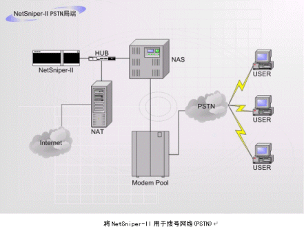 上圖中,NetSniper-II可以對網(wǎng)絡內部各用戶進行檢測,一旦發(fā)生某個用戶安裝代理服務器軟件,其他用戶通過該用戶的接口上網(wǎng)偷逃網(wǎng)費的情況,或發(fā)現(xiàn)盜用MAC地址上網(wǎng)及通過Modem回撥上網(wǎng)的情況,NetSniper-II即可定位這些用戶,并且采取通知系統(tǒng)管理員或自動封堵非法用戶等措施。