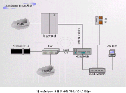 NetSniper-II也可以作為局端設備,用于xDSL(ADSL/VDSL)、PSTN(電話撥號網(wǎng)絡)、HFC(有線電視網(wǎng)絡)等。此時,NetSniper-II能夠有效的防止控制共享上網(wǎng)、盜用MAC地址上網(wǎng)和Modem回撥上網(wǎng)的情況發(fā)生。下面兩個圖例指出了如何將NetSniper-II用于局端。