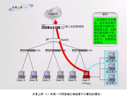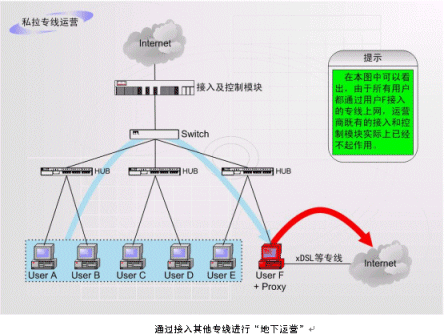非法運營情況之二:如上圖中的F用戶作為運營商的合法包月用戶,上網(wǎng)服務開通以后,在自己的計算機中安裝代理服務軟件或者安裝路由器,這樣就可以隨時糾集若干住戶分攤包月費用,甚至私設網(wǎng)吧。
