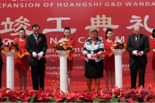 2011年9月21日, 湖北黃石。 黃石捷德萬達(dá)金卡有限公司在湖北黃石的工廠舉辦竣工典禮,慶祝公司第四期廠房擴(kuò)建項(xiàng)目順利竣工并投入使用。