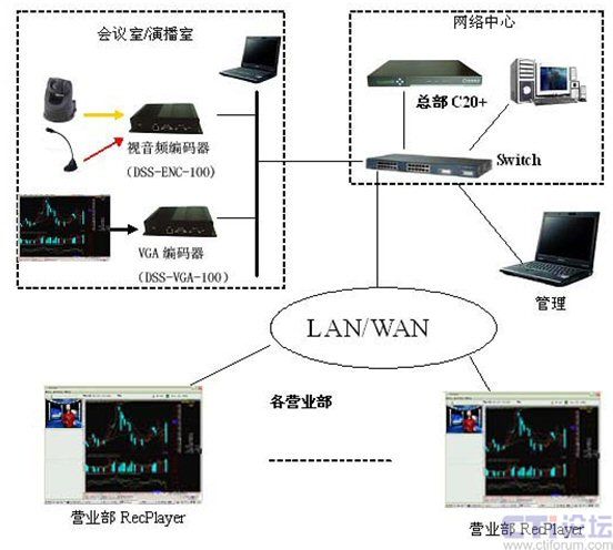 在分析了華安證券的實際需求和網(wǎng)絡(luò)環(huán)境以后,決定采用一套DSS-R-C20+來組建整個流媒體系統(tǒng)。系統(tǒng)由媒體采集系統(tǒng)視音頻編碼器(DSS-ENC-100)/VGA編碼器(DSS-ENC-100),流媒體處理和錄制系統(tǒng)(C20+)和客戶端RecPlayer組成。通過此系統(tǒng)可以實現(xiàn)語音、視頻和計算機桌面的同步實時直播、錄制和點播。系統(tǒng)的結(jié)構(gòu)圖如下: