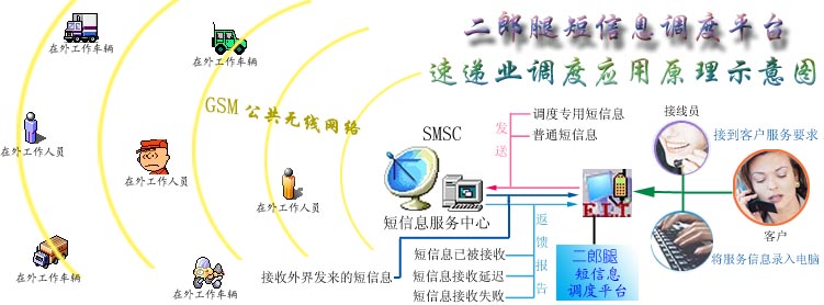 二郎腿短信息調(diào)度平臺(tái)是利用目前社會(huì)上大眾普遍擁有手機(jī)的現(xiàn)成資源,通過(guò)移動(dòng)通訊公司提供的短信息服務(wù)功能作為通信信道,直接對(duì)手機(jī)進(jìn)行低層操作控制,以“收發(fā)短信息”的方式來(lái)實(shí)現(xiàn)信息的傳遞(通信資費(fèi)標(biāo)準(zhǔn)與在手機(jī)上收發(fā)短信相同)。調(diào)度平臺(tái)還對(duì)每條發(fā)出的信息的接收狀態(tài)進(jìn)行跟蹤,確保信息能被安全