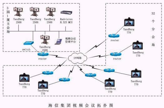 山東海信集團(tuán)有限公司會議電視項(xiàng)目以海信大廈為中心,覆蓋各個省的35個分支機(jī)構(gòu)。充分利用自己網(wǎng)絡(luò)資源的優(yōu)勢,采用ITU(國際電聯(lián))的H。323標(biāo)準(zhǔn)。于-2004-年初經(jīng)過系統(tǒng)方案的征集、產(chǎn)品的反復(fù)測試,最終確定了由華夏科技代理的挪威TANDBERG的視頻終端,并于2004年6月份簽訂了一期采購合同,共計36套視頻終端。
