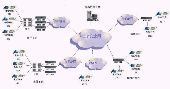 深圳市蓋威科技有限公司完整的語音解決方案如下,用一個網(wǎng)管平臺(AVS SERVER)來管理眾多企業(yè),各企業(yè)分支機(jī)構(gòu)間可以實(shí)現(xiàn)相互通話免話費(fèi),另外將企業(yè)內(nèi)部通話之外的電話通過網(wǎng)管平臺接入到電信營運(yùn)商的VoIP