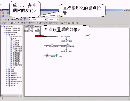 ·支持圖形化的斷點設(shè)置,單步、多步調(diào)試的功能。在需要設(shè)置斷點限制的地方,選擇該節(jié)點,鼠標點擊斷點調(diào)試功能按鍵,則任何經(jīng)過該節(jié)點的流程都會在該節(jié)點暫停,等待開發(fā)者察看或者修改輸入輸出變量、腳本。點擊執(zhí)行下一步,則流程會經(jīng)過該節(jié)點,在下個節(jié)點暫停,如果開發(fā)者不想單步執(zhí)行,可以點擊執(zhí)行按鈕,則流程立刻執(zhí)行不會停住。如圖3.2所示。